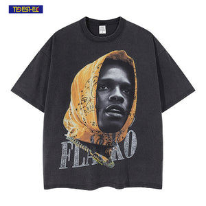• TIDESHEC 2022 Summer Men T-shirt Streetwear Vintage Washed Rapper Portrait Print T-shirt Cotton Oversized Graphics Tee Top